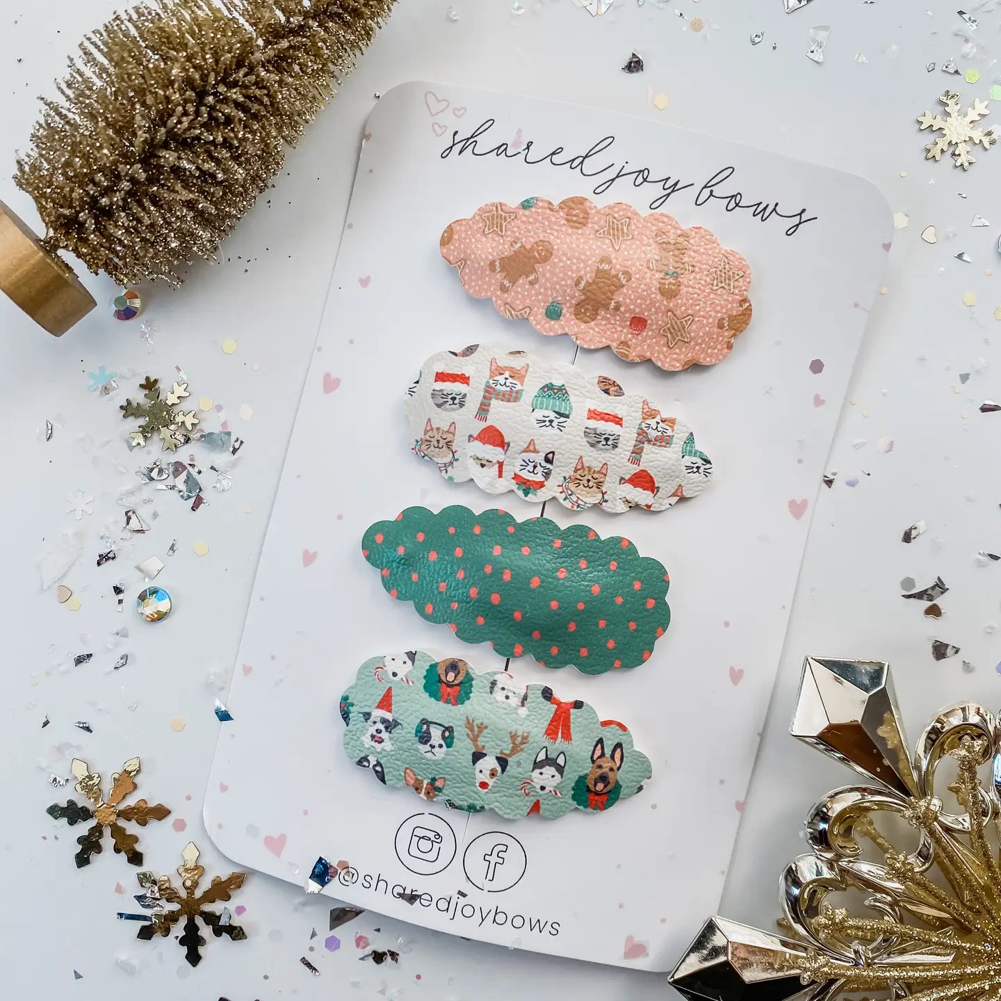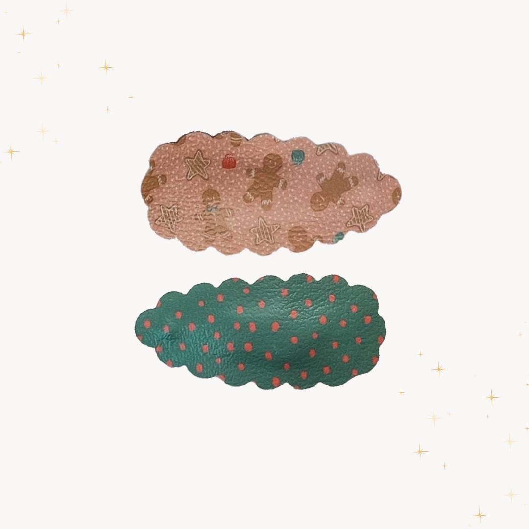 Elevate your child's holiday style with our hand cut leather snap clip accessories. Each piece is meticulously crafted for a festive touch, adding charm to your little one's ensemble. These unique accessories blend artisanal craftsmanship with playful holiday motifs, ensuring a delightful and stylish accent for every joyful occasion.